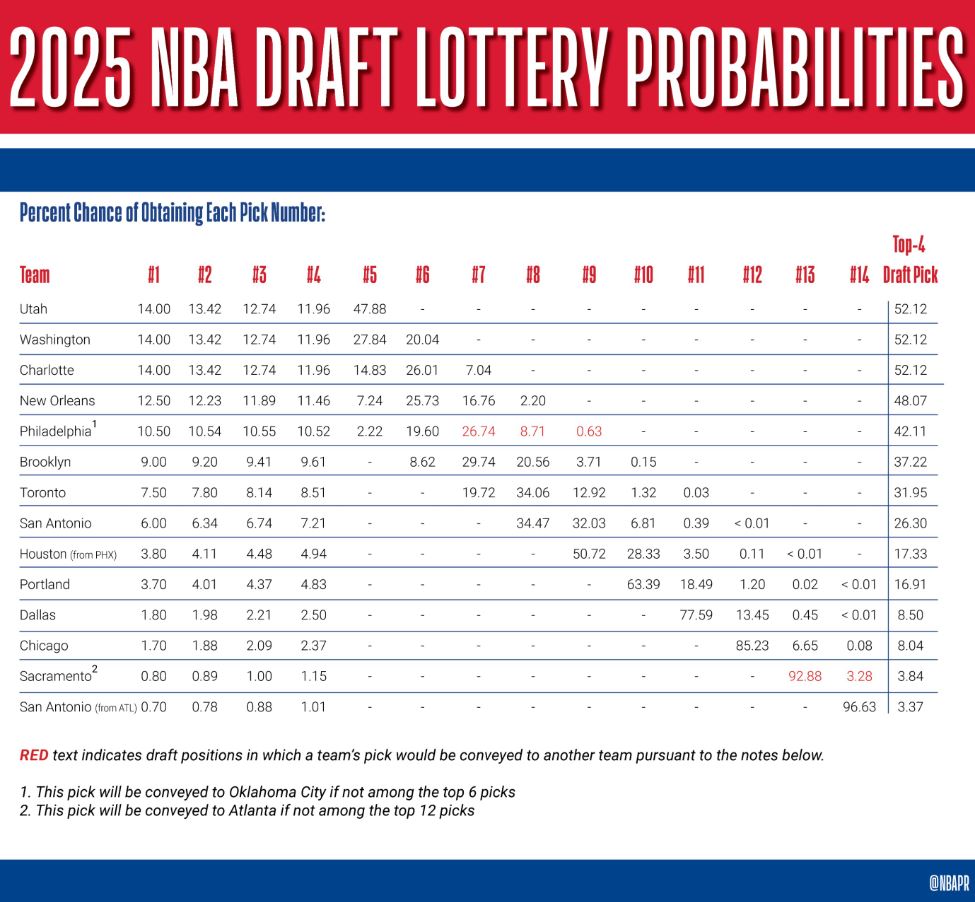 Todos os 14 times não classificados aos playoffs têm algum tipo de chance. Em 2025, por exemplo, quem tirou a sorte grande foi o Dallas Mavericks, que tinha apenas 1,8% de chances de terminar em primeiro. A escolha foi utilizada para draftarem Cooper Flagg.